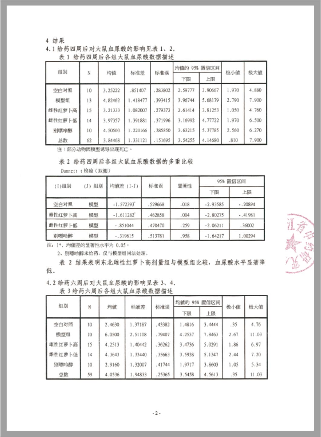 結(jié)論:血尿酸升高是引發(fā)痛風(fēng)的一個(gè)重要原因。實(shí)驗(yàn)結(jié)果表明,東北雌性紅蘿卜對于酵母加腺嘌呤誘導(dǎo)的高血尿酸大鼠模型,以30g/kg的劑量給予四周后,其降尿酸效果具有高度統(tǒng)計(jì)學(xué)意義。說明“抗風(fēng)紅·東北雌性紅蘿卜”對于尿酸升高引起的痛風(fēng)具有顯著的作用。